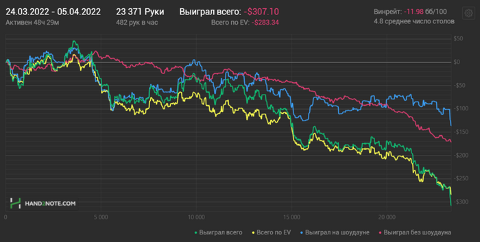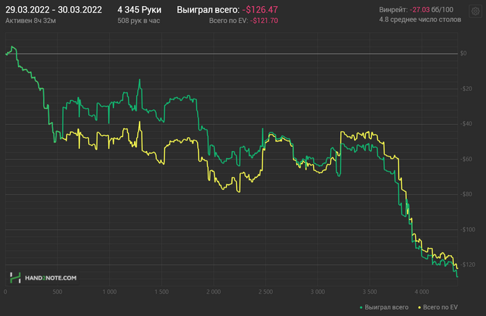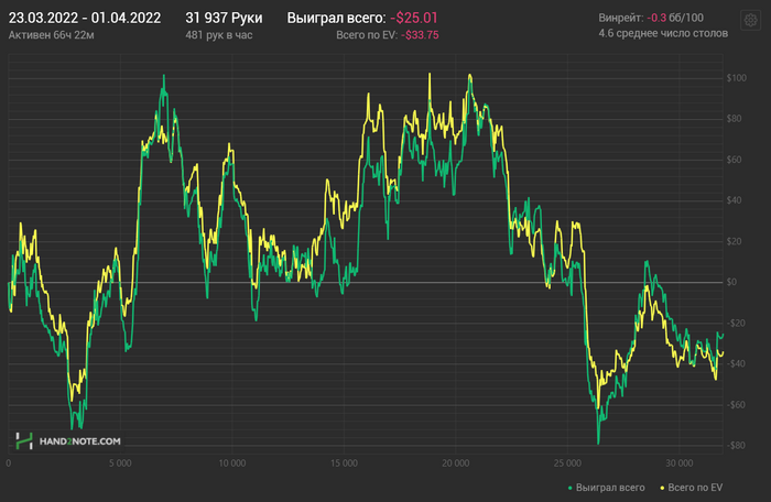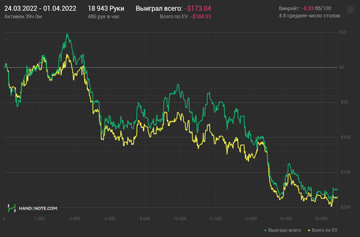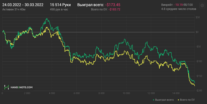 irlak, дело в том, что 30к рук это считай ни дистанция. Я вот тоже плюсовал на чико, а вчера на десяток стеков улетел. Так же раздавали не очень, и тильтанул слегка.