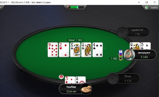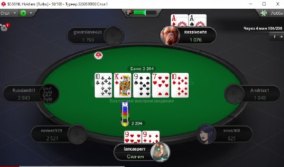 На первом столе вышла в ХА с небольшим перевесом, пришли тузы, разыгрываю стандартно: колл, на рейз - оллин, вижу там девятки: