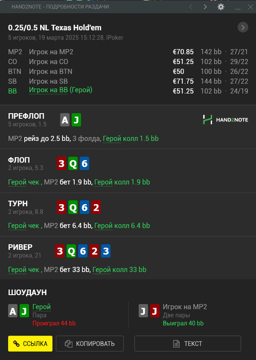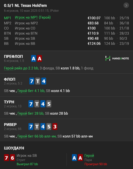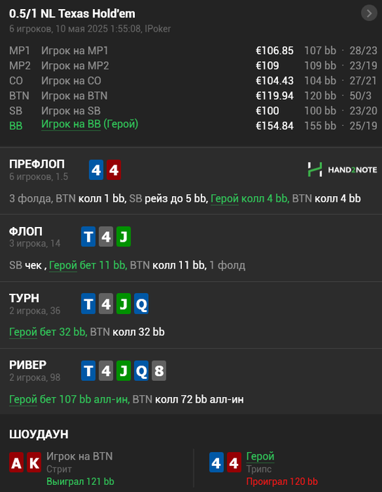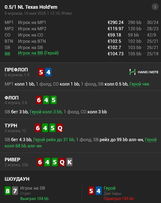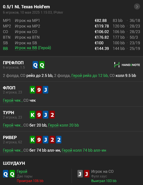 Опп играет законченными линиями блефа, даже почти всё шд играет велью-блефами по риверу. С учётом этого мы уже на терне решаем-либо фолд, либо кол и чек-кол ривер. Линии кол терн и чек-фолд ривер тут у меня уже не может быть против такого оппонента.