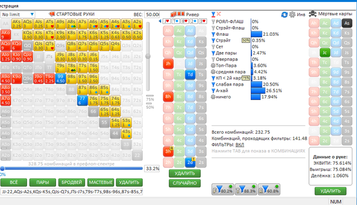 треть по флопу на тонкое велью мне нравиться, держу рейз небольшой или провоцируем велью оппа рейзить крупно на такой структуре и уже сдаваться тогда, в случае кола можем урезать топвелью оппа, что я и сделал. Терн овербет уже на прямое велью идёт и его кол опять режет сильно его топ спектр. Короче на ривере ему даже если задать все флеши часть двух пар и часть стритов, то там блефов и вельюблефов вагон можно насобирать и будет иметь точно больше 33% необходимых..у меня так вообще 70%+ вышло на скорую руку: