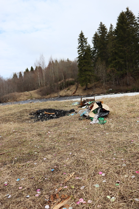 Казалось бы что может пойти не так, когда гуляешь весь день вдоль реки, плавно перетекающей из города в лес? Ответ : ебанные уникумы, догадавшиеся взрывать хлопушки на природе. Намного проще убраться там где прошли 100 алкашей и выкинули по пустой бутылке водки чем там где какая-то "приличная" семья взорвала хлопушку. Собирали эти куски в траве добрые полтора часа и в лучшем случае убралось собрать половину. Больше тупо не осилили, так как были жутко голодные после многочасовой ходьбы. С хлопушками в России вообще ад, после нового года все усеяно этой мелкой пластиковой хуетой(напомню что на фото конец апреля)