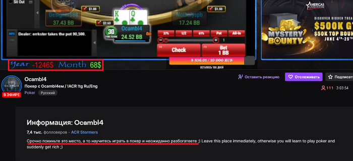 Ну и напоследок хочется сказать про канал, который мне постоянно пихают в рекомендации на твиче. Покер с Осамычем.