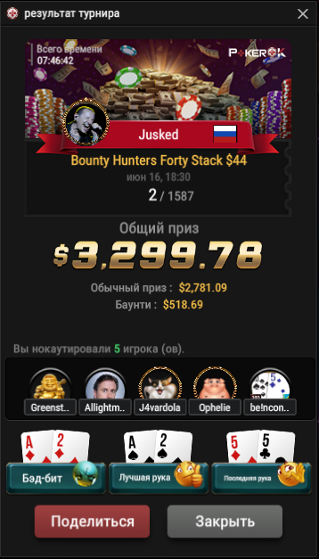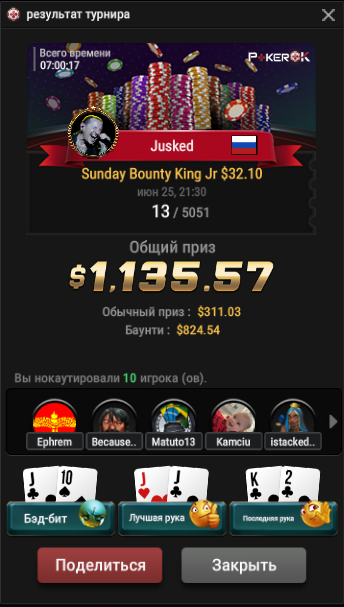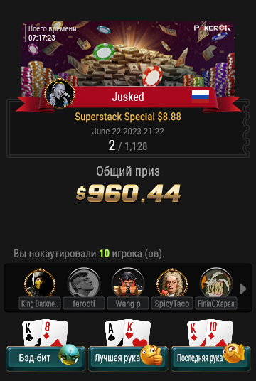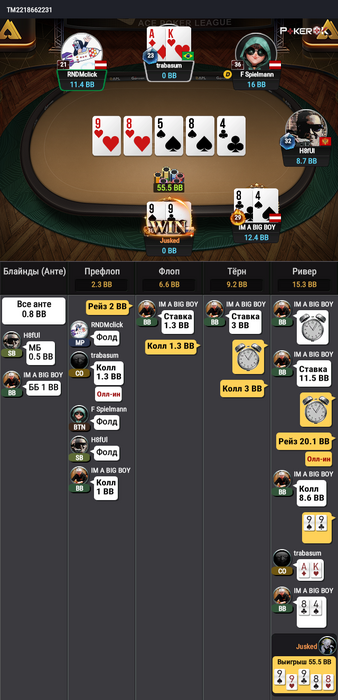 В итоге на его преимуществе 2к1 по фишкам, всё закончилось тем, что я комплит-пушнул 55 на 30бб, упоролся в 99 и закончил выступление.