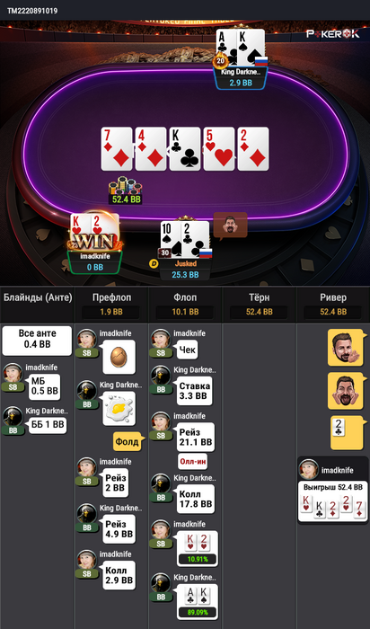 Айсимайзера нет, не знаю насколько хорошо или плохо сыграл. Человек уж очень часто рейзил мои комплиты, подумал что и в этот раз наверняка мусор и решил ставить олл-ин. В итоге оппу за первое насыпали 7к. Оппонент хоть и помечен любителем, но пару раз против других оппов сыграл хорошо, где надо подслоуплеивал на яйцах, где надо продавливал, победу точно заслужил. Тем более вроде как русский (по-крайней мере в чате транслитом русские слова писал).