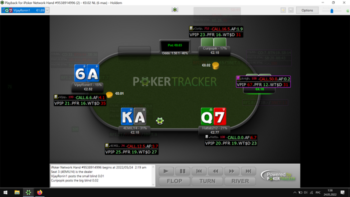 ститистики практически нет по этому я не делал 3Бет стандартного размера я даже не рассматривал этот вариант потому что банк мог выйти из подконтроля и на ривере мне пришлось бы колоть100% на любую ставку