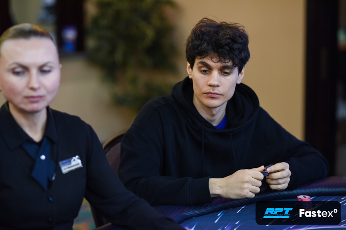 Майкл Балабекян так торопился покушать, что проблефовал весь стек по четвертой паре Александру Шумскому. Тот инста принял оллин по терн с двумя парами и ушел на перерыв с удвоенным стеком.