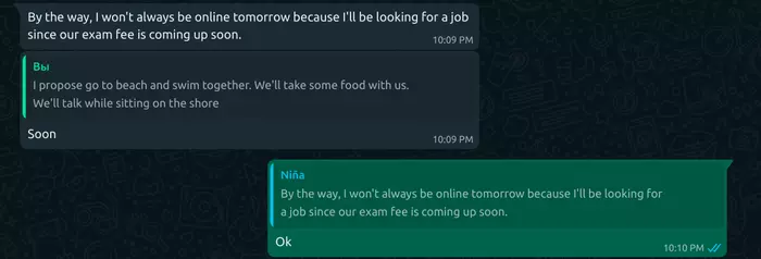 Пока мы общались онлайн она намекала на помощь в оплате ремонта телефона и учёбы.Конечно я это проигнорировал, потому что все об этом просят. А даже если не все то отправлять $400 человеку которого ещё не видел это полнейшая глупость. Тут даже упоминание было об этом.