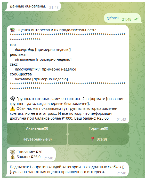 Не стала дальше раскручивать ничего. Но если девочка заинтересовалась, то она будет заходить в этот бот, тегать админа и разговаривать с ним. Один на один. Админа можно выбрать, в итоге наша девочка стала общаться с админом мужского пола, который называл ее "солнышком".