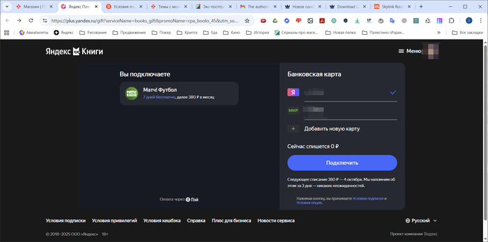 Оплачивала подписку на H2N4 через СБП, там стоит рекламная система, которая "предлагает выбрать подарки", 50, 40 145 и тд колесо крутится, мне никогда меньше 145 подарков не предлагали)) Беру иногда промокоды на корм. А тут увидела "бесплатные 45 дней на Яндекс.Книги - и обычные и аудио". Получаю промокод, перехожу в Яндекс.Плюс, кликаю на оформление, и та-дам! Мне пытаются впарить вот этот вот шлак за 380 р/месяц 7 дней бесплатно, потом списание автоматом )) Ну до чего милые люди!