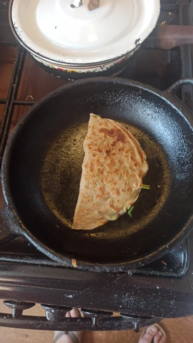 Теперь процесс. К каждой сковородке надо приноровиться, у меня тяжёлая чугунная. Разогрела, чуть маслом, первый получился как обычно, комом. Выбросила. Дальше так: наливала на сковороду порцию полковника (он небольшой) и распределяла по сковороде методом покачивания в разные стороны. Надо, чтобы тесто покрыло всю сковороду тонким слоем - именно так надо выбрать объём на выпекание одной лепёшки. И подождать не торопясь, чтобы лепёшка как следует пропеклась с одной стороны. Переворот. Взять зелени, положить на лепёшку, чтобы можно было второй половиной закрыть - и закрыть (эта сторона уже поджаренная). Прижать края лопаткой. Перевернуть на вторую сторону. Лепёшка должна быть подрумянена с обоих сторон. Выложить на тарелку, смазать сливочным маслом (например). Повторить насколько хватит теста.