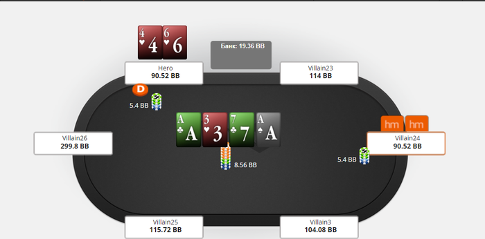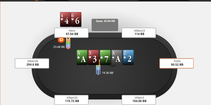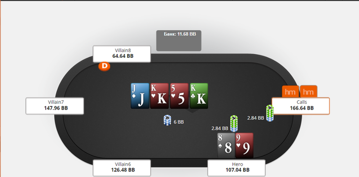 дабл бэли 5-4s без фд дошли малым весом, ведь что-то донкнуло флоп, что-то почекрейзило, чуточку донкнуло турн и очень много сфолдило на второй барелья, так что по машине эта комба почти что не существует тут, пусть это будет еще одним небольшим подспорьем для меня для того чтобы не отказываться от блефа ривера. Насчет моей линии и сайза ривера мы посмотрим что думает визард