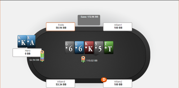 cнова турн за 66%, выбиваем 5-5, 4-4 с картой вмасть или без, 6-6, Kх червовые, давим на 7х, если получим колл то ривер будем решать, так и получилось