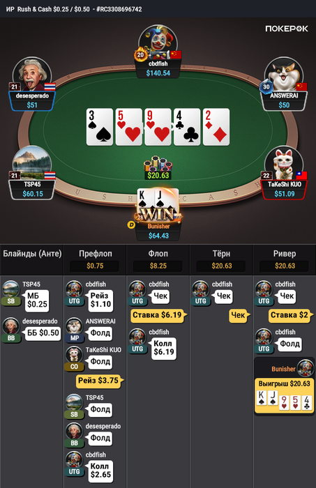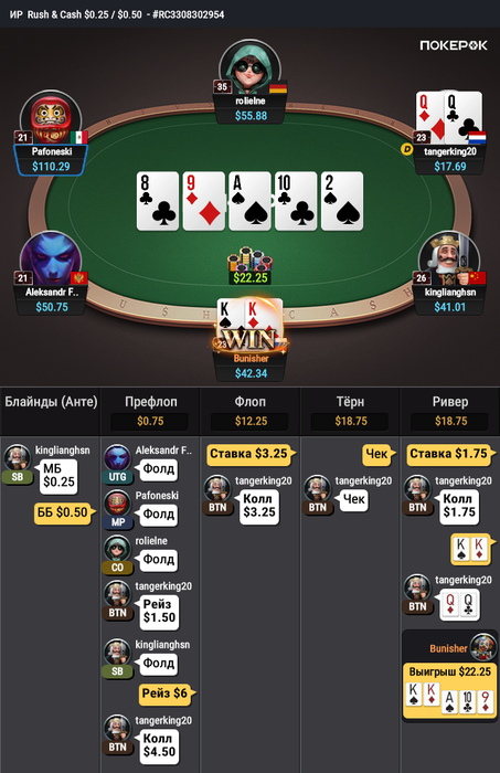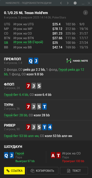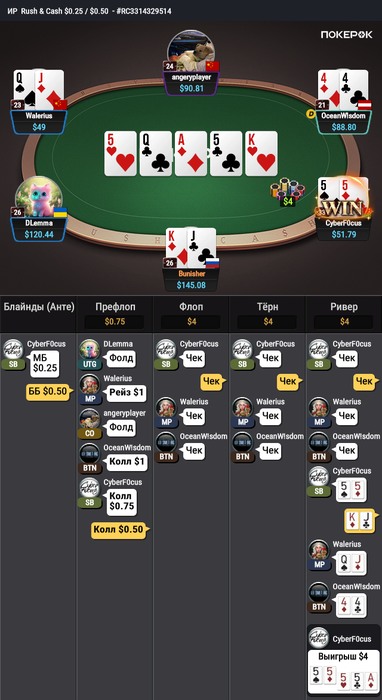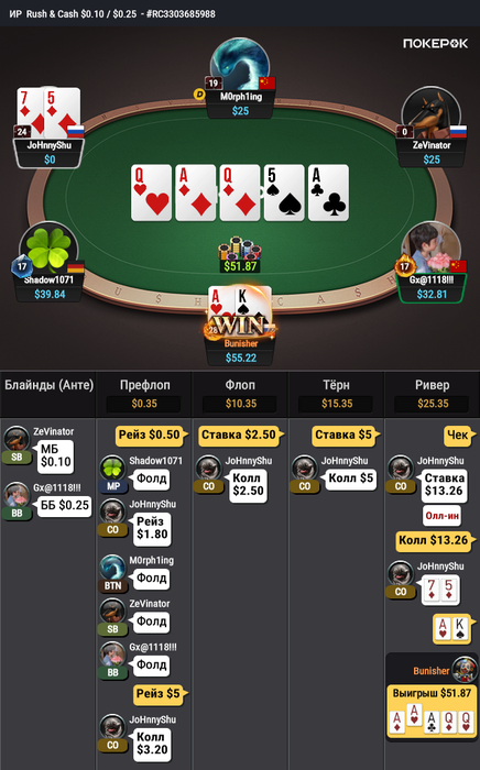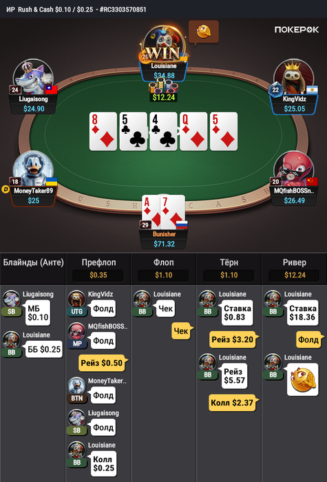 Вторая раздача интересная. Получается, ждем у оппа руку Q5?