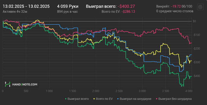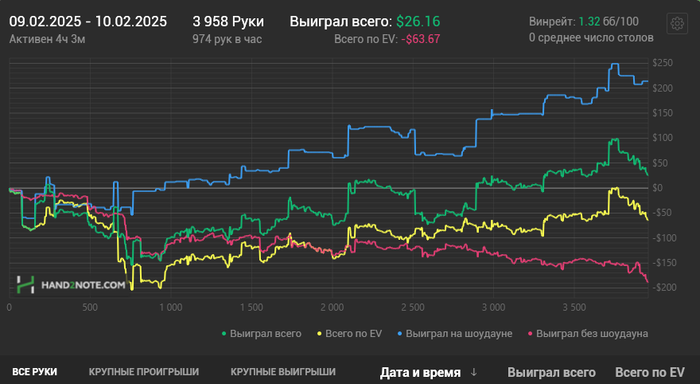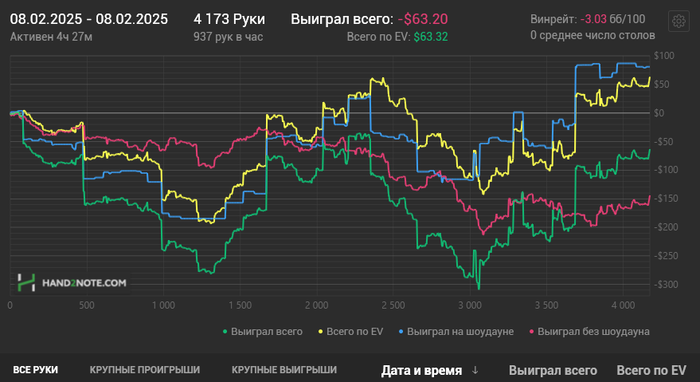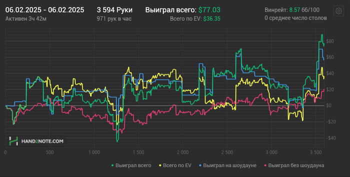 Простудился, пришлось лечиться в срочном порядке, благо симптомы почти прошли. В выходной занимался теорией. Вечерняя сессия выдалась тяжелая, результат -370$, ран я оцениваю на 3/10. Играл близко к A-гейму. Грубых ошибок практически не было. Очень много стремных ранаутов приходило в 3бет и 4бет потах на ривере, когда банки уже по 120+бб. Делал вынужденные фолды. Продолжаем работать, диспа вернет, надеюсь. Началась третья декада марафона. Осталось откатать 32к рук, возможно придется сыграть одну гонку на нл50. Открыл осьминога, дали 250$. В раше нл50, нужно катать идеально и хорошо чувствовать поляну, особенно если без гонок, только на ВР.