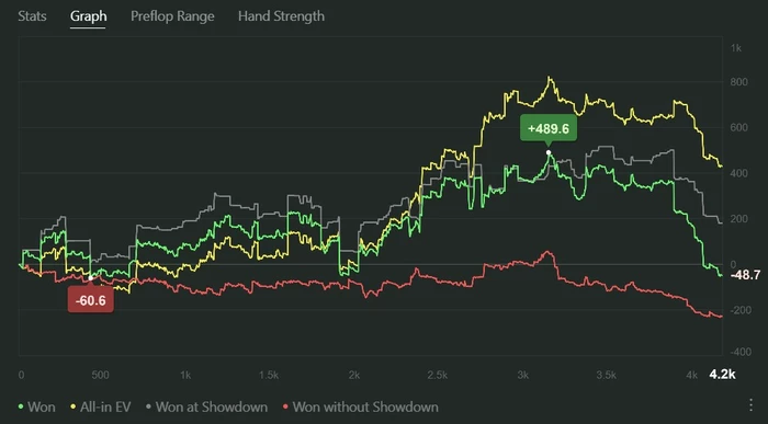 По ЕВ заработал 214 долларов, а по факту 85. Почти в 3 раза меньше. И если честно, я уже устал от этой херни. Ведь на самом деле эта херня с недодачей началась ещё в августе или сентябре прошлого года, когда я начал шотать нл25. По ЕВ у меня было около 4,5 бб /100, а по факту -1,7 бб / 100. Потом в декабре, я перешел на нл10 и немного попустило, был даже небольшой переап. И вот опять переключили рубильник и диспа нагибает меня.