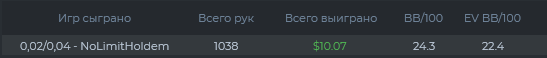Доволен, что не тильтанул играть около нуля на нл2, считаю это прогрессом. Деньги не чувствуются и тяжело играть в адекватный покер, когда цена ошибки не такая высокая.