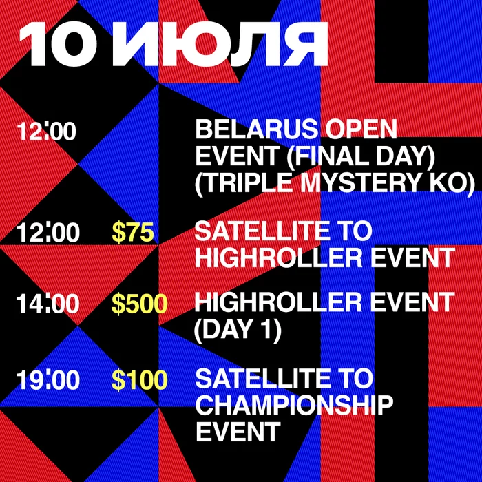 ⏱ В 12:00 пройдет $75 Satellite to HighRoller event. Стартовый стек 15.000, блайнды по 10 минут, поздняя регистрация 8 уровней.