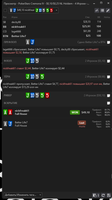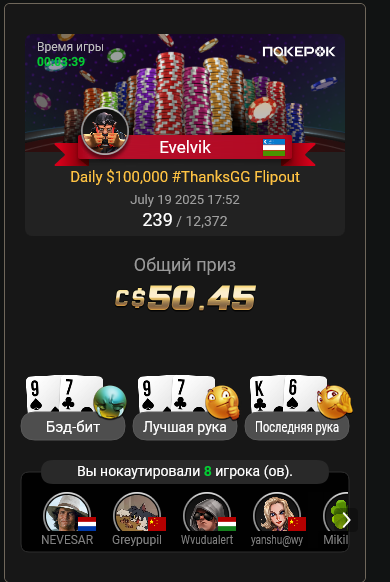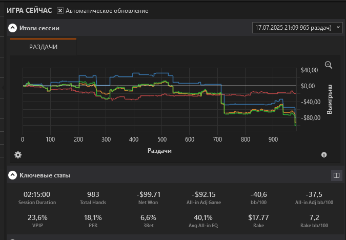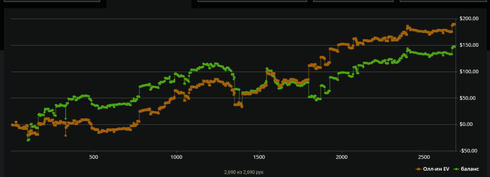 Evelvik @ 27.07.25Azilya93, У меня общий бр по румам больше 1к$ так что мне можно.В фонде гринлайн есть игроки которые стабильно плюсуют на покерке.Главное хорошо селектить ,не играть регокатки и сузить префлоп ренжи под высокий рейк покерка, фишей 50+ там очень много, так что я спокойно нахожу 6 столов с випами.Тогда можно будет держать двузначный винрейт, который позволит бить лимит.Если поиграю и окажусь не прав, то вернусь на старзы, ничего страшного.