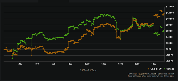 С утра встал пораньше откатал короткую сессию так же на покерке, +63$.Покеркрафт показывает график без рейка,поэтому нет смысла его смотреть, ориентируюсь на кассу.Раз в неделю думаю буду выгружать в хм3 раздачи,лень каждую сессию это делать.Фишей с впип 50+ было море,если б не домашние дела(детей смотреть надо) играл бы дальше.Это график за 4 сессии.Рейк конечно ппц на покерке, но повезло что во флипауте насыпало.