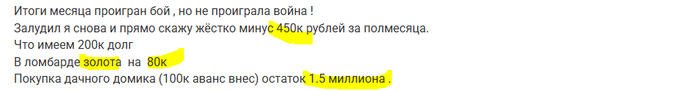 за прошлый месяц проиграно 890к. хотел забрать задаток на строительство домика. Но сказали, что строительство уже в процессе и нельзя забрать задаток. Сказали, что нужно начинать вносить остаток суммы. предложил оставить в качестве задатка жену, плюс золота ещё на 50к на ней и вернуть мне задаток 100к на строительство дачного домика. Знаю что мы и не такое вместе проходили. Я столько раз ее подводил что даже всех пальцев на руках не хватит пересчитать. Плюс со здоровьем у неё проблемы. думаю то, что она теперь задаток за дом не сильно отразится на ее здоровье.