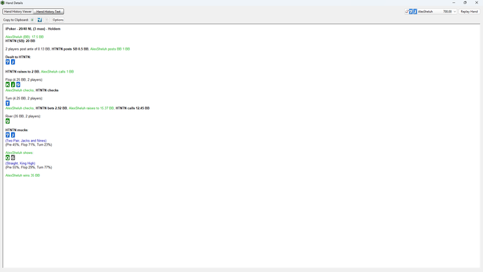 Сейчас мне это кажется посредственной игрой, у оппонента миллион доперов, которые он донкает по терну, явно лучше было кольнуть терн. Я в этом споте банально испугался доски, но сейчас есть ощущение, что у оппонента здесь явный перекос в вэлью, на тройках в целом реги редко блефуют донком терн. Опять же, возникает вопрос, если мы колим и падает , как в этом споте, есть ли у нас колл ривера? 35% думаю точно отбил бы, а вот с 75% не уверен.