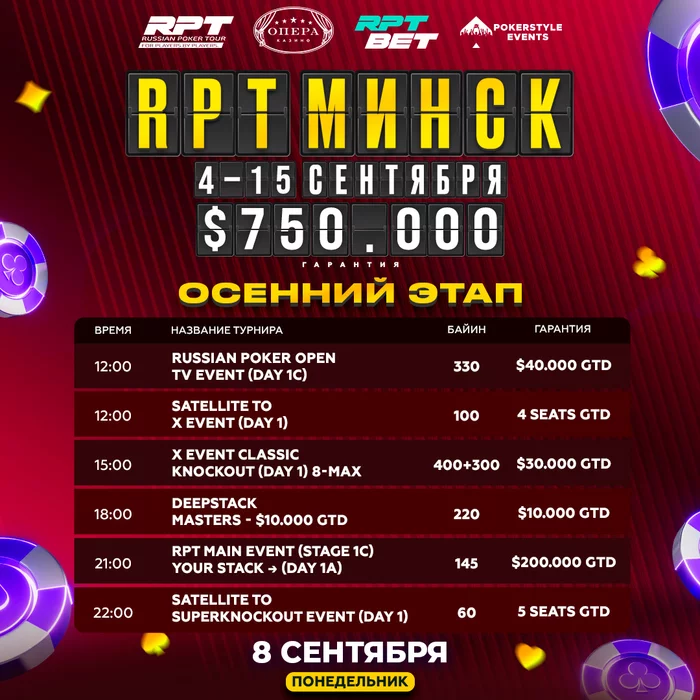 ⚫️ В 21:00 пройдет $145 RPT Main event (Stage 1С) — your stack — day 1A. 20% участников пронесут свои стеки в целевой турнир.
