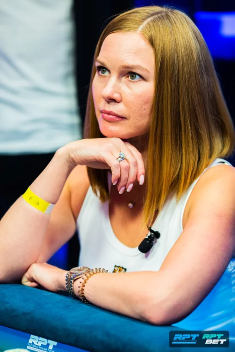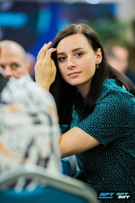 За другим столом столновение произошло между Николаем Никоновичем и Эллой Ефремовой. Элла подколлила открытие Николая на поздней, игроки на блайндах тоже зашли в раздачу.