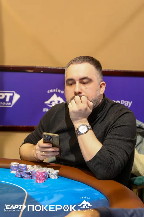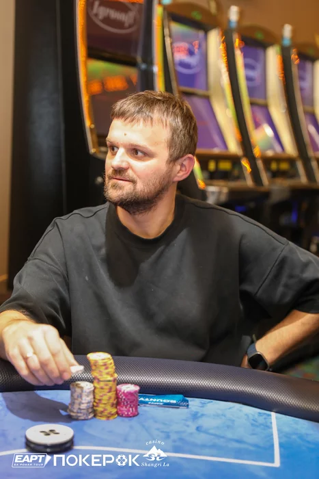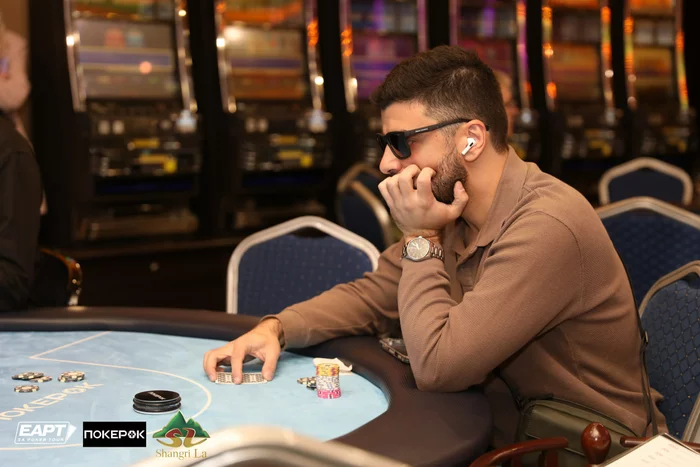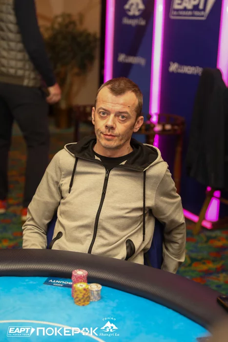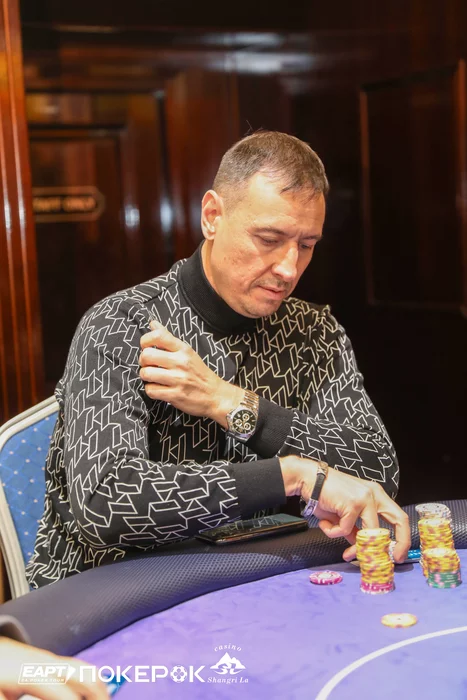 Кирилл Куренков в 5-максе был самым коротким, но выиграл две монетки с двойками и четверками, и поправил положение. В очередной раздаче он запушил 180,000 с катоффа с , а Борис Карапетян (200,000) на ВВ после раздумий уравнял с .