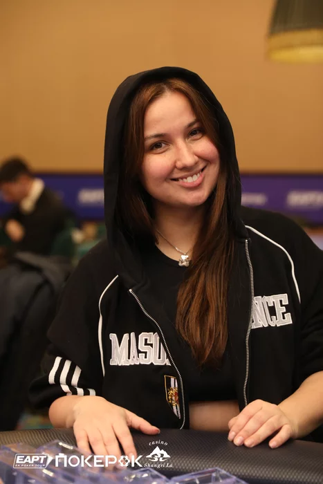 Стол 2. Чиплидер Анастасия Головачева открылась 25,000 с HJ, Антон Рябов (135,000) запушил с большого блайнда, Анастасия уравняла с .