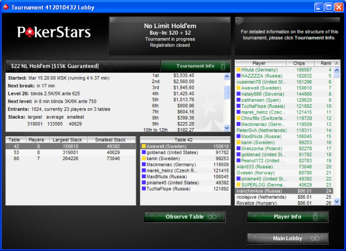 Poker Stars $20+$2 No Limit Hold'em Tournament - t75/t150 Blinds + t20 - 9 players -
