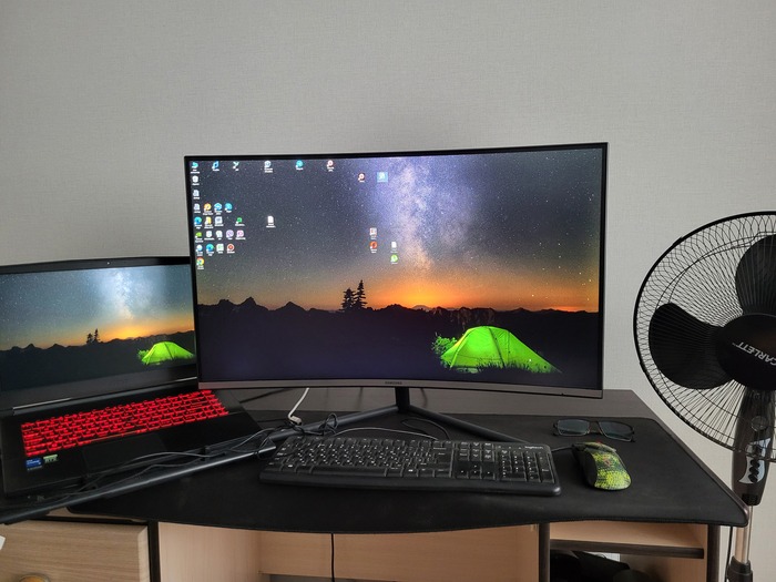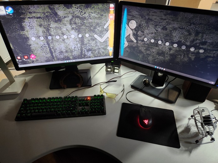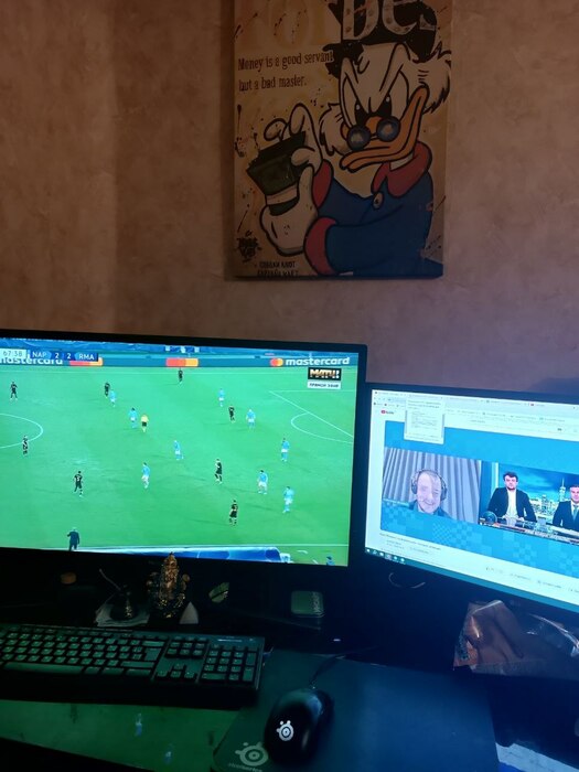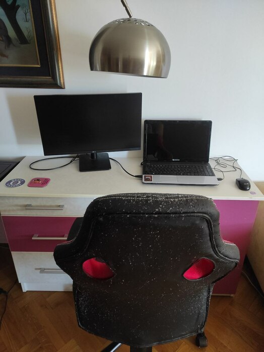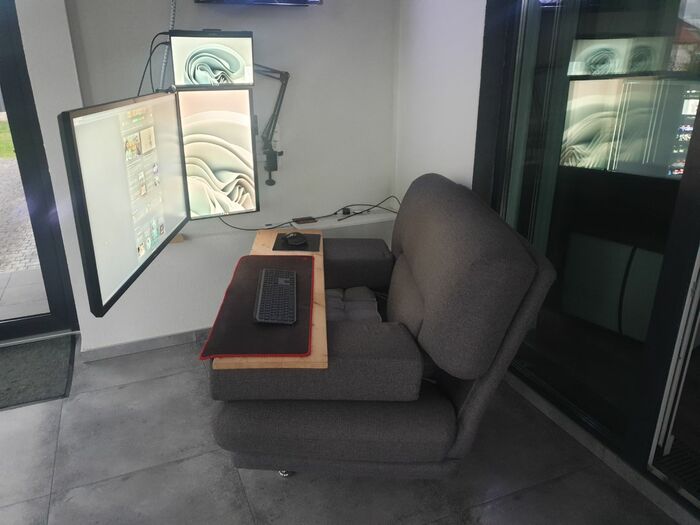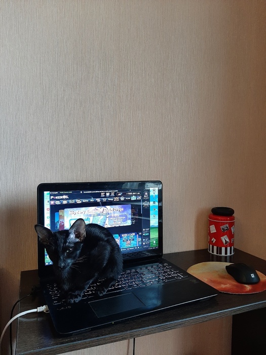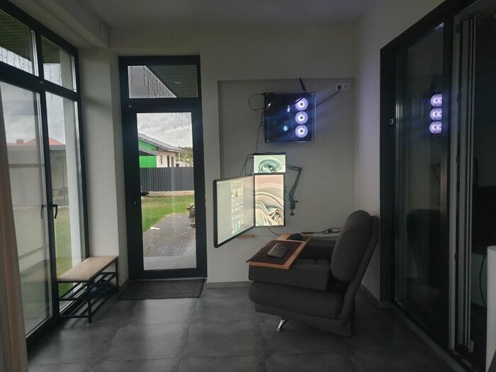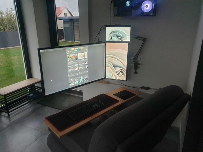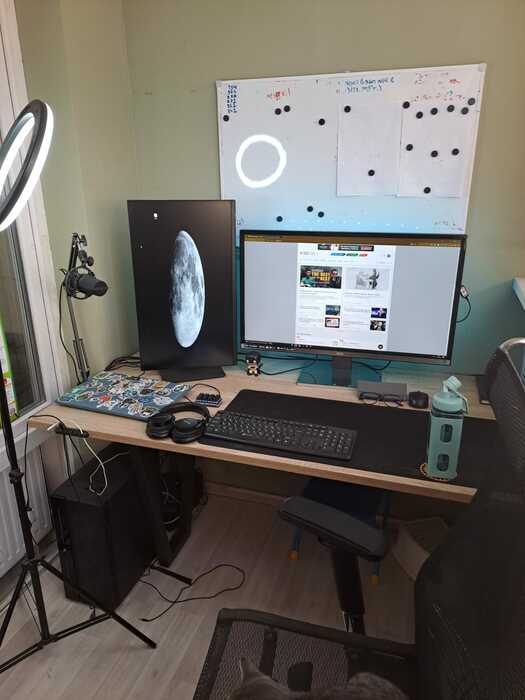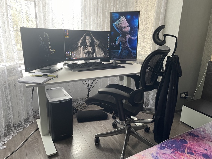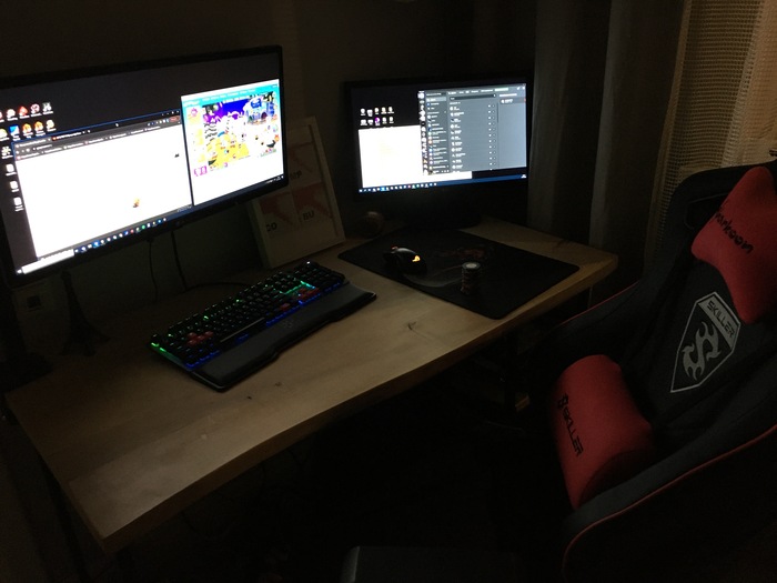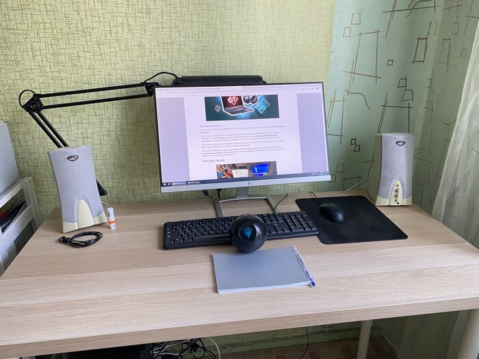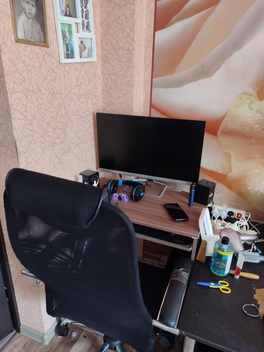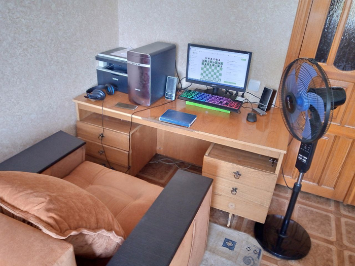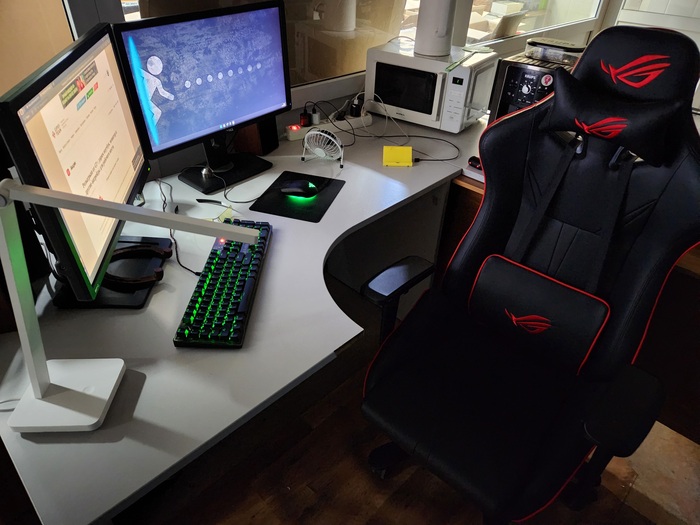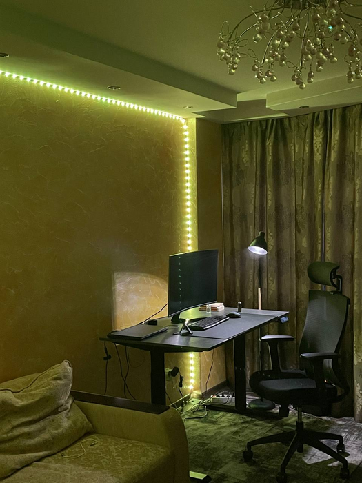 С кабель-менеджментом конечно же проблемы). Светодиодная лента вместе с лампой конечно творят чудеса) Стол с электроподъемом оказался очень практичной штукой, особенно когда пятая точка принимает состояния камня. Ноутбук Lenovo legion 5, монитор Samsung, модель не помню, разрешение 2к, 144гц, для покера более, чем достаточно. А вот клавиатура и мышь от Сanyon за 10$, надо менять)