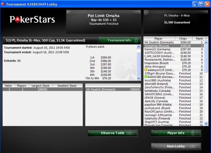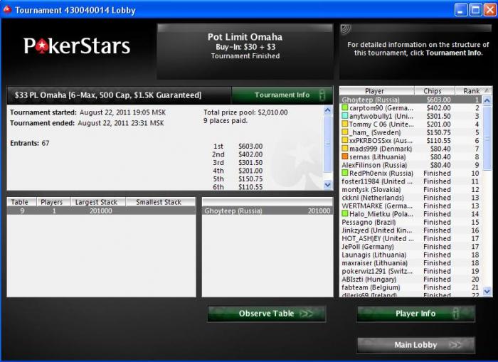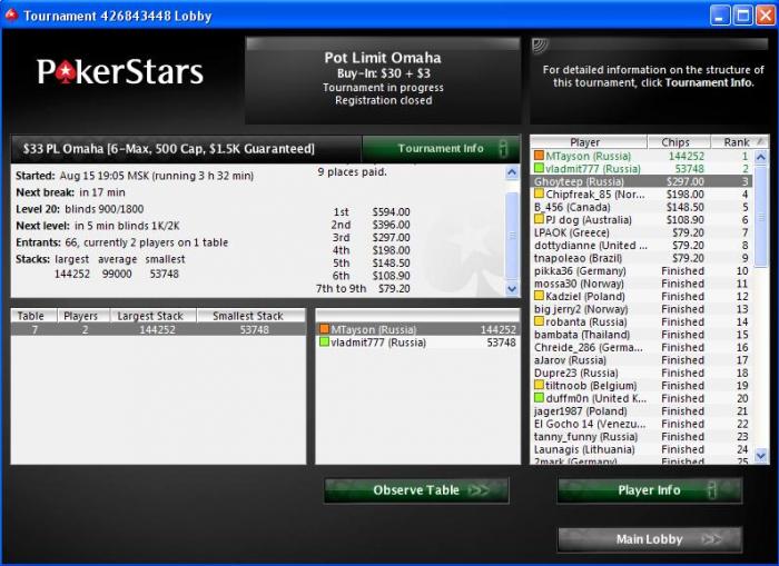 Играю в любительской лиге, МТТ на 2-3 столах. Набираются очки в общий зачет, и под конец сезона - турнир чемпионов. Но за Топ4 всегда призы, в пределах $15 - $70. Пока "дистанция"=7 турниров: один топ4, один доезд. К сожалению, сейчас перерыв и играем только раз в неделю фо фан (очки не начисляются), а за топ1 дают $25. А ты как часто в оффлайне?