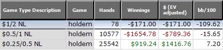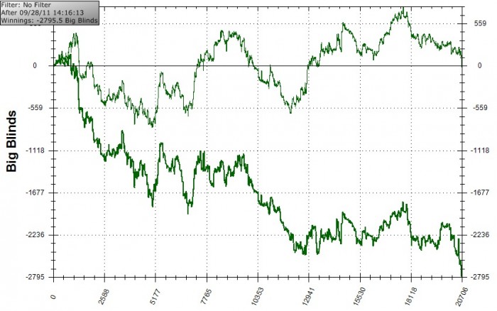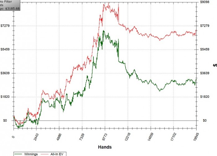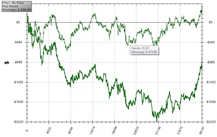 Вот и наступил конец месяца, этого мегадерьмового месяца... За 3 года я многое успел повидать, но просадка на почти 50БИ, растянувшаяся на 35к рук... Раньше я думал, что такое невозможно! Теперь я хотя бы знаю, что это такое. Что ж, тоже ценный опыт. Хорошо как минимум то, что, несмотря на то, что это был самый плохой месяц в моей карьере и первый минусовый месяц со времен хедс-ап кеша, он практически не повлиял на мою будничную жизнь. Конечно, частенько в этом месяце я чувствовал себя как полное говно, но это чувство довольно быстро рассеивалось, как только я выходил из дома. Оценки я даже не знаю как себе выставлять. Игры было мало, так что 36к рук оценю на 4. Тильтоустойчивость... Хм... Ну залил по тильту баксов 400 максимум... Что на фоне одного большого даунстрика длинной в месяц я даже не знаю... ну на 3+ чтоль. 4ку за такое тоже не особо поставишь. По профиту полное Г: