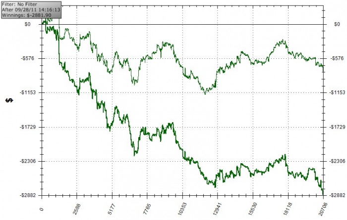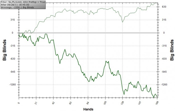 NickV @ 29.10.2011 Да я тогда вообще играть не буду, т.к. у меня даже линия ЕВ нифига не отражает ситуации. У тебя же недобор складывается при плюсовом профите, а значит тебя просто переезжают в оллинах, а в остальном норм. Меня же помимо ЕВ еще и жесточайше имеют на постфлопе: т.е. мало того что бесконечные кулеры не в мою пользу, дак меня еще и во всех крупных банках ривером по 5% убивают стабильно... Т.е. для меня 3 переезда подряд это вообще изи по несколько раз на дню, и если делать каждый раз перерыв, то я за столы садиться не буду успевать =).