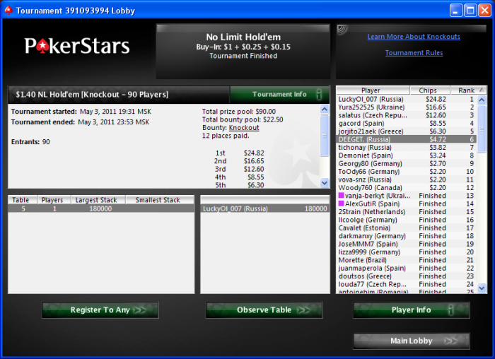 Я начал грузить сессию, сыграл уже несколько нокаутов, как вдруг мои миленькие 1,4 стали исчезать из лобби. А на их смену стали появляться инородные 1,43. Ну я подумал фиг с ним, такой же турик, только рейк повысили на 3 цента.Держите свои дурацкие три цента, PS!!! Начал грузить 1,43. И тут я почувствовал, как будто меня шлепнули палкой по голове сзади в темном переулке. Стек 1500 (вместо начальных 2000), уровни по 6мин. (вместо 10). У меня начался тильт. Ядрёна кочерыжка, я же супер-пупер рег 1,4! А мне какую-ту турбину подсовываюсь. После одного турнира, я прекратил регистрацию и решил приглядеться. Хотя деваться мне, по сути, было некуда.