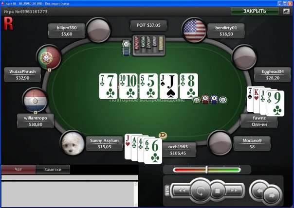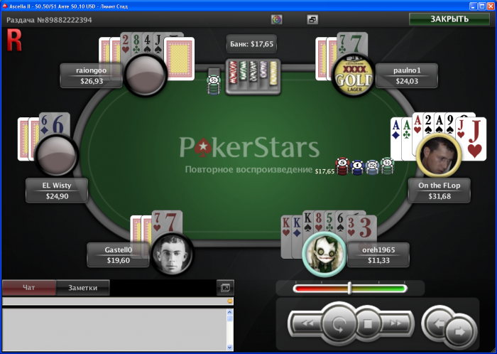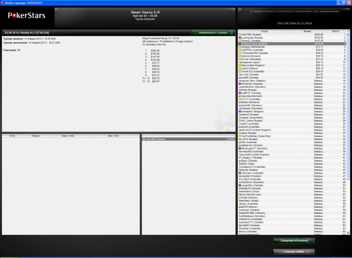PokerStars Турнир №570010101, Лимит Омаха Хай/лоу Бай-ин: $5.00/$0.50 USD 73 игроков(а) Общий призовой фонд: $875.00 USD Турнир начался 23.04.2012 9:35:00 MSK [23.04.2012 1:35:00 ВВ]