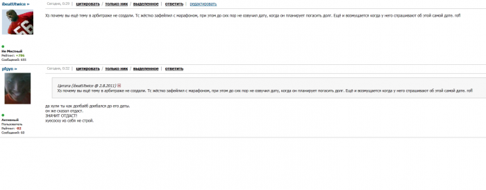 Хз почему вы ещё тему в арбитраже не создали. Тс жёстко зафейлил с марафоном, при этом до сих пор не озвучил дату, когда он планирует погасить долг. Ещё и возмущается когда у него спрашивают об этой самой дате. rofl