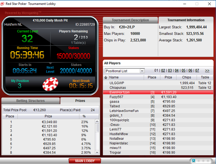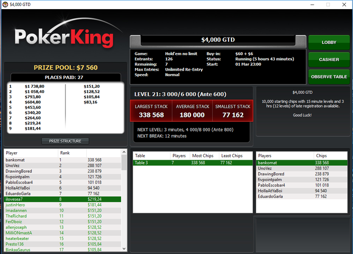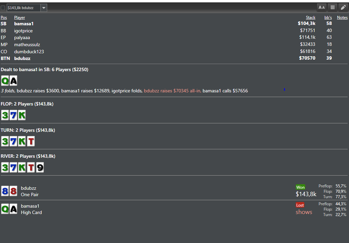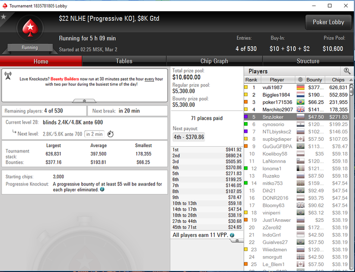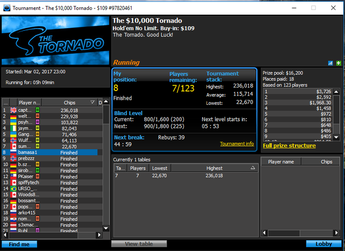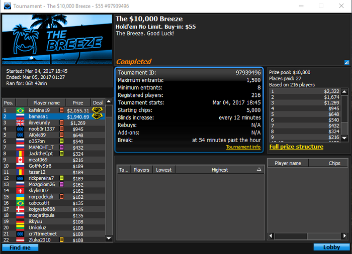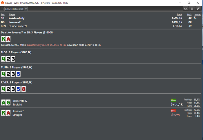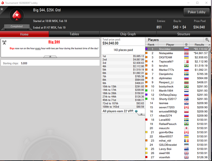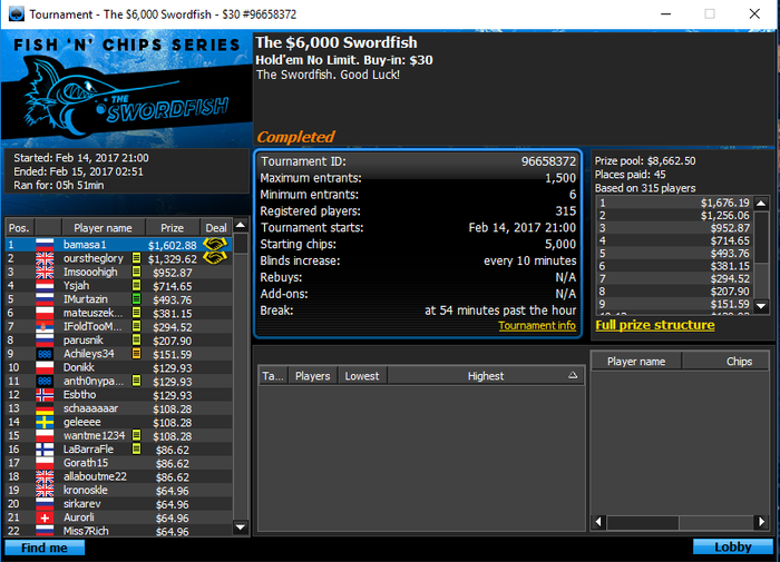 Сегодня была очень насыщенная сессия. Взял реванш за вчера в свордфише, доехал до 4-го в 30-ке на пс. Еще успел вылететь в мош пите 12-ым с АА префлоп за чип стек и посидел на небольшой финалке дип стека на 888, но там дали совсем немного, так что скринить не стал
