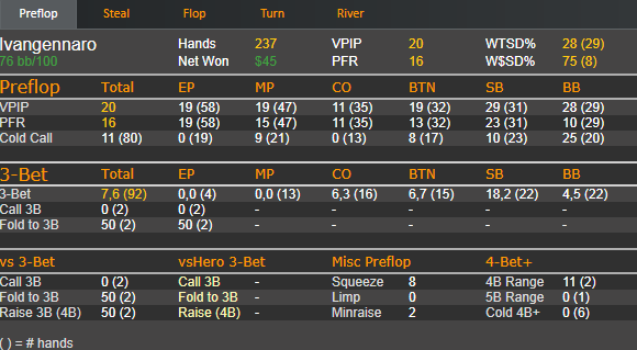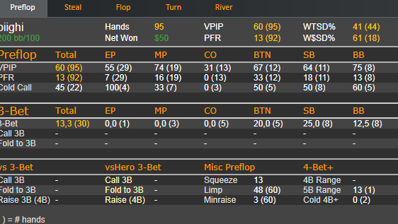 3) Оппонент довольно агрессивный рег, но раздач немного чтобы выразить характер этой самой агрессии(всего 96 рук) Более удобные варианты игры, ривер оптимален чекпас, сыграл из рук вон плохо. Изначально думал о ререйзе флопа и о ставке терна. избрал худшую линию и остался без информации.