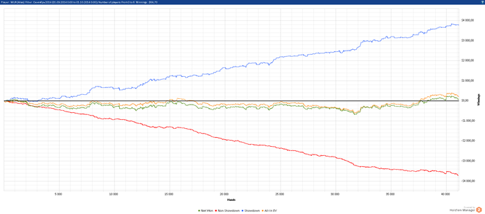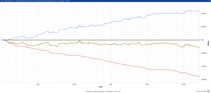 Ну если брать в целом, то месяц принес свои плюс тоже: -Когда началась ересь в конце месяц я купил тренировки у чела по 6 максу, получил новые знания. Тренировки еще продолжаются. Стараюсь применять новые знания, но говорить о том, что мой стиль кардинально поменялся это фейл и надо накатать не один десяток тысяч рук, чтоб видеть результат. Сам для себя знаю, что идет мне на пользу и получил часть ответов на свои вопросы. -вообще в сентябре, я работал над игрой больше всего за последнее время. Когда я приехал в Тая, у меня есть дурацкая привычка: когда играю херово заливаю, то не смотрю результат сессии и то может быть 1-3 дня быть так, а просто играть. А если сыграл в хороший плюс, то могу посмотреть руки. В общем это фейловый подход. Сейчас после "тренировок" я перед каждой сессией смотрю свои руки, чтоб мозг настроился на работу и потом в бой. - Начался сезон фут.зала, мы с друзьями арендуем зал и бегаем там 2 часика командами 5\5, всего 3 команды и играем на вылет, из-за того что скинул лишний вес в тае, сейчас бегаю в норм форме.
