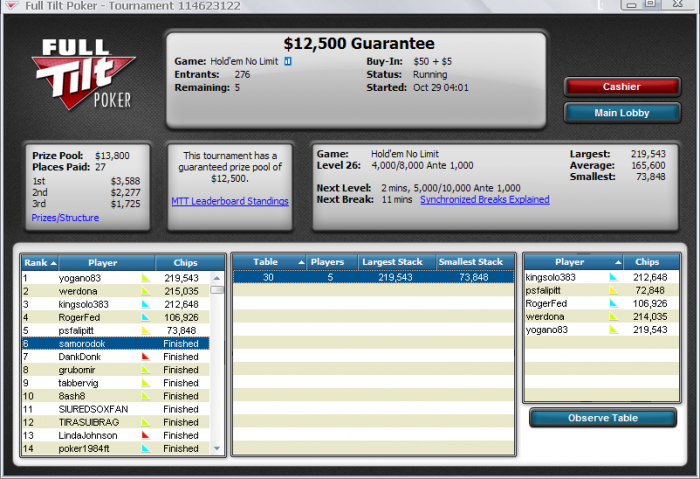 Привет ВСЕМ! Месяц заканчивается, поэтому напишу маленький отчётик. Итак мой первый месяц, как POKERPRO закончился. Напомню я с 1.10.2009 зарабатываю только покером. Я очень доволен, что он закончился со знаком +. Главной задачей этого месяца было почувствовать уверенность в своих силах, а именно разницу между покером-хобби и покером-работой. Стал играть более увереннее и понял, что развиваюсь в верном направлении. Кстати, турниров сыграл в октябре не намного больше, чем в другие месяцы. Поэтому целью номер один на след. месяц будет увеличить кол-во турниров до 250! Сегодня играть не буду. У моей футбольной команды банкет, по случаю выхода в следующую лигу. А завтра опять к станку! Удачи Всем за столами!