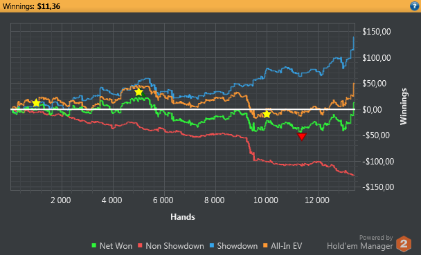 По графику там где пошел провал по красной - это я зашел на нл25 на разведку и залил, как последняя рыба чуть больше стека. Игра на нл25 мне показалась совсем уж нитовой и фишей на много меньше, чем на нл10.