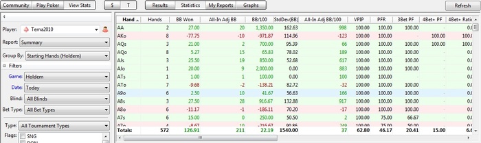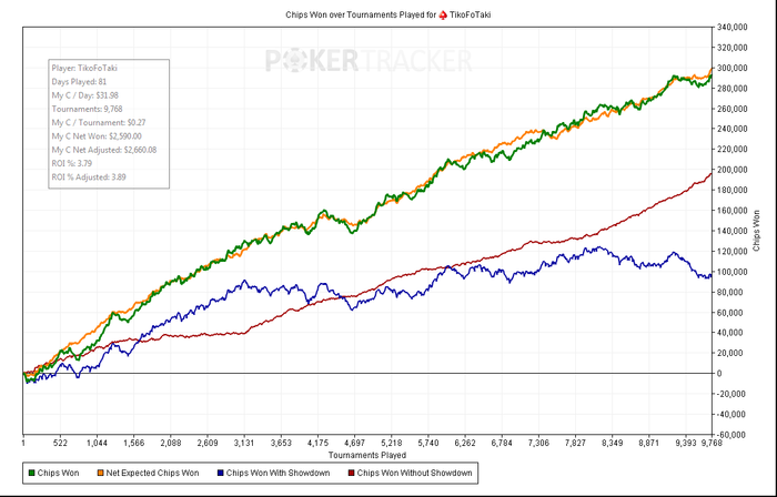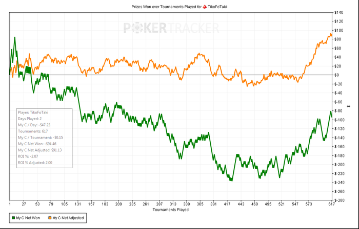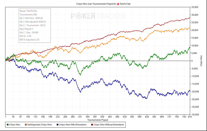 Июль - Август играю мало, за исключением последних пару дней ( около 600 турниров за 2 дня), так что дистанция не велика. Всего сыграл за 2 месяца 7 дней, и то сразу не пошло на 15$,пришлось из-за недостаточного бра спуститься на время на 7$, но скоро надеюсь вернусь =) Вот график.