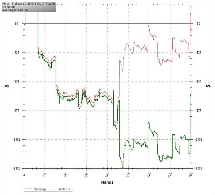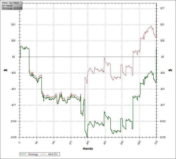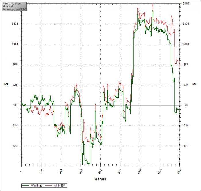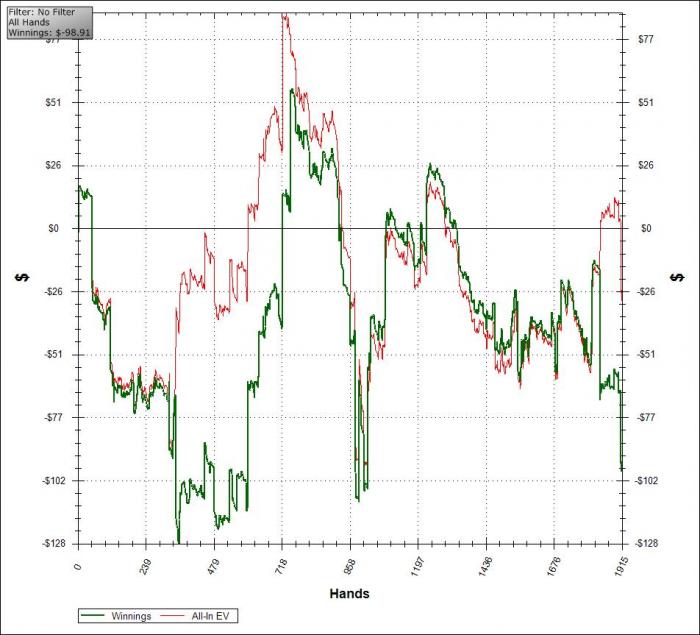И так немного о покерных делах. Играл немного nl50, сегодня меня тренировал местный форумчанин Feid, за что ему отдельное спасибо :) На pokerstars как всегда бедбиты и кулеры (флеш на флеш с флопа, аллын на тёрне и оппоненту доезжают 4 аута), на fulltilt - всё ок. По EV винрейт получается вполне приличный кстати. Нашли кучу ликов в моей игре, даже не искали - они сами в глаза бросались. Прикладываю график, руки как-то не по времени распределились... Планирую и дальше пытаться играть hu cash.