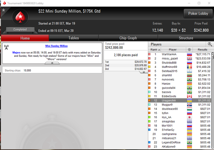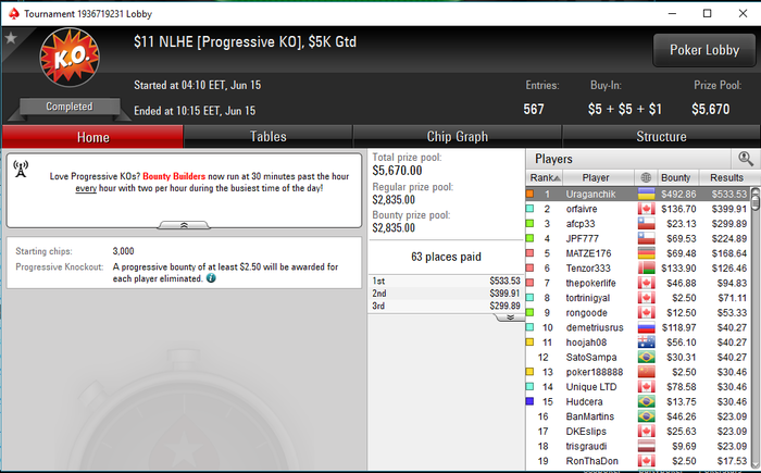 Чуток нажил. Как то так получилось что практически ни разу не переехали, разок я с АК прибил АА и в ХА по динамике переехал чувака К10 в АК баксов на 250 ) А в остальном по игре хорошо получалось. Устоял имея в стеке 1,5 бб на бабле будучи на большом блаинде и дальше понеслась, потом на предфиналке закрыл чувака, который на говне на бабле изолировал другого что бы забрать мой баунти )