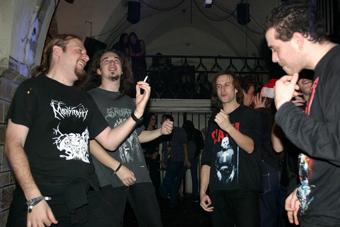 Откопал пару фоток тех лет. Весёлые были времена, концерты, подвалы, попойки, угар. Главная проблема металлистов в том, что соотношение девушек к парням в подобных местах было примерно 1 к 20. Зато было задорно :)