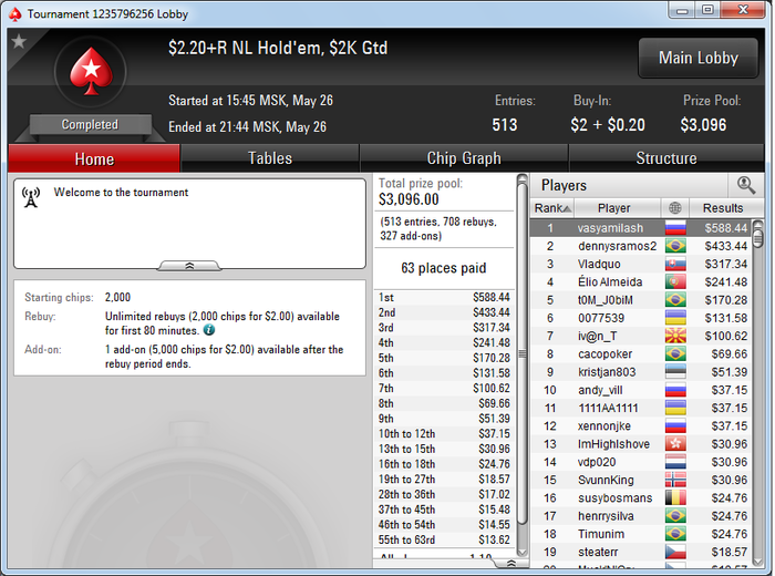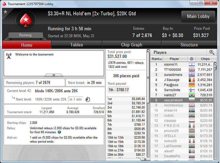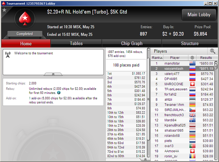 нет, я вас обманул))...сегодня все срослось...после дележки ушел в ситаут, парняге оказался нужен лидерборд, зато он сдвинулся на 20 баксов по чип-чепу. Огромное спасибо, Moonglade . Без твоей ауры, которая потоком маны разлилась по мне, когда я был 11-ым стеком из 15-ти, я бы не смог ничего сделать. Он даже сумел наколдовать каре с 44 в тройном олене с КQ и 99.