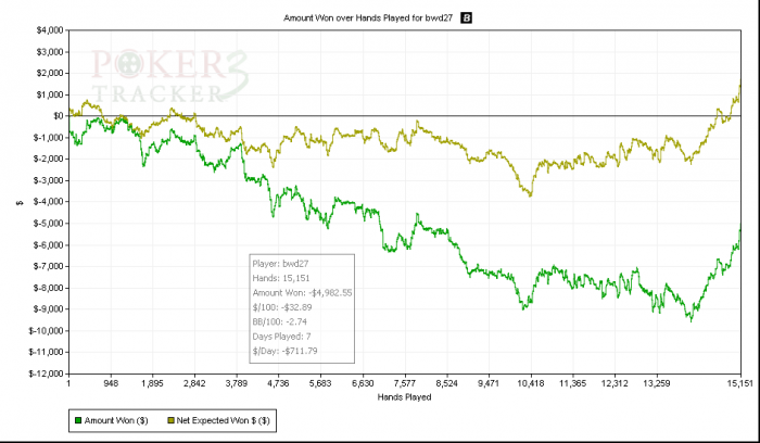 Опять ощущение говна в речке - куда течение, туда и я. Вначале выигрывал, был даже редчайший перебор по ЕВ, ситуации были нормальные. Потом, самое смешное, что когда был в плюсе 2500, уже ушёл в ситаут и собирался закрывать столы (не из-за суммы, а просто хотел закончить сессию тогда), однако там было несколько фишей и я решил остаться, пока ещё не очень устал. Результат - ну просто явно чувствовалось, что течение пошло против меня. Ни одного выставления я выиграть не смог. Как будто старс опомнился "Что за фигня, как мы дали ему перебрать по ЕВ? А ну-ка - исправить!". Ну и пошло поехало .
