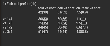 hasubart, спасибо за развернутые мысли. Проблема отложенного цбета IP в фиша в том, что велика вероятность, что мы его не поставим. Мы вынуждены блефануть сами, чтобы не стать жертвой чужого широкого блефа на терне. Если же мы ставим с воздухом, то как выяснили мы получаем на некоторых досках оверфолд прямо сейчас и сохраняем некое эквити руки, даже если она мисснула. Фактически делая ставку на флопе мы увидим все 5 карт с высокой вероятностью, а с учетом того, что мы заходили с более узким диапазоном на префлопе у нас будет больше возможностей разрулить, даже если мы не попали во флоп. Так что при игре против фиша я склонюсь к бету флоп, если ситуация подходящая, а на ривере просто буду смотреть линию XC|X|B и ее наполнение, и иногда очень выгодно коллить или рейзить в блеф. Это очень простой и понятный план, который если и потеряет в EV, то мы всё равно никогда этого не узнаем, так как если и всерьез решим считать EV действий против фиша, то наш корабль цифр разобьётся о рандом в дейтсвиях оппонентов, который к риверу примет высокие значения. Так что удобнее просто играть в эксплоит и надеяться, что у нас будут какие-то шоудауны на фиша по самым частым линиям.