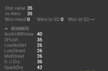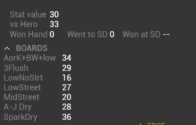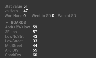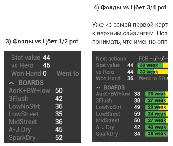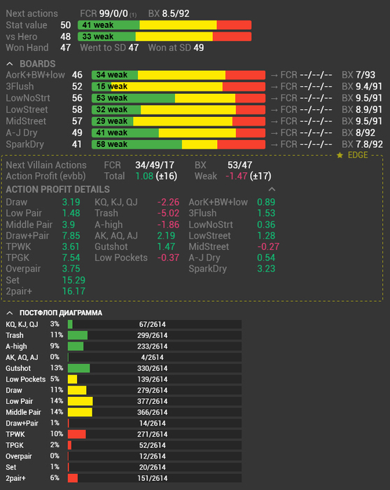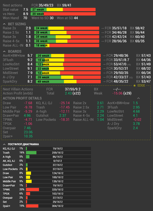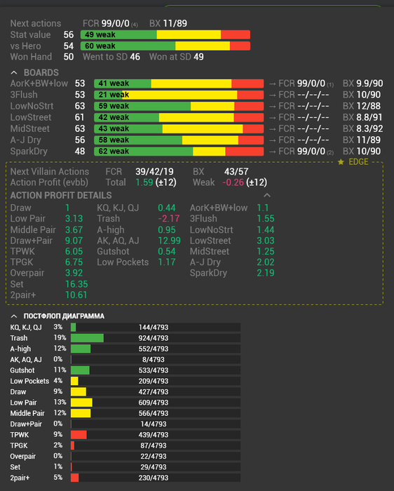 Увидев эти цифры я сильно удивился. На всех типах досок оверфолд гораздо бОльше чем по трети. Поставить полпота в блеф выглядит очень качественным решением, чтобы выбить мусор на тех же сухих-бродвейных досках, спарках и 3флэш. Также мы редко выбьем какую-то часть туз-хай рук. Смотрим колл-диапазон под спойлером (объем тузхай уже не 12%, а 9%)